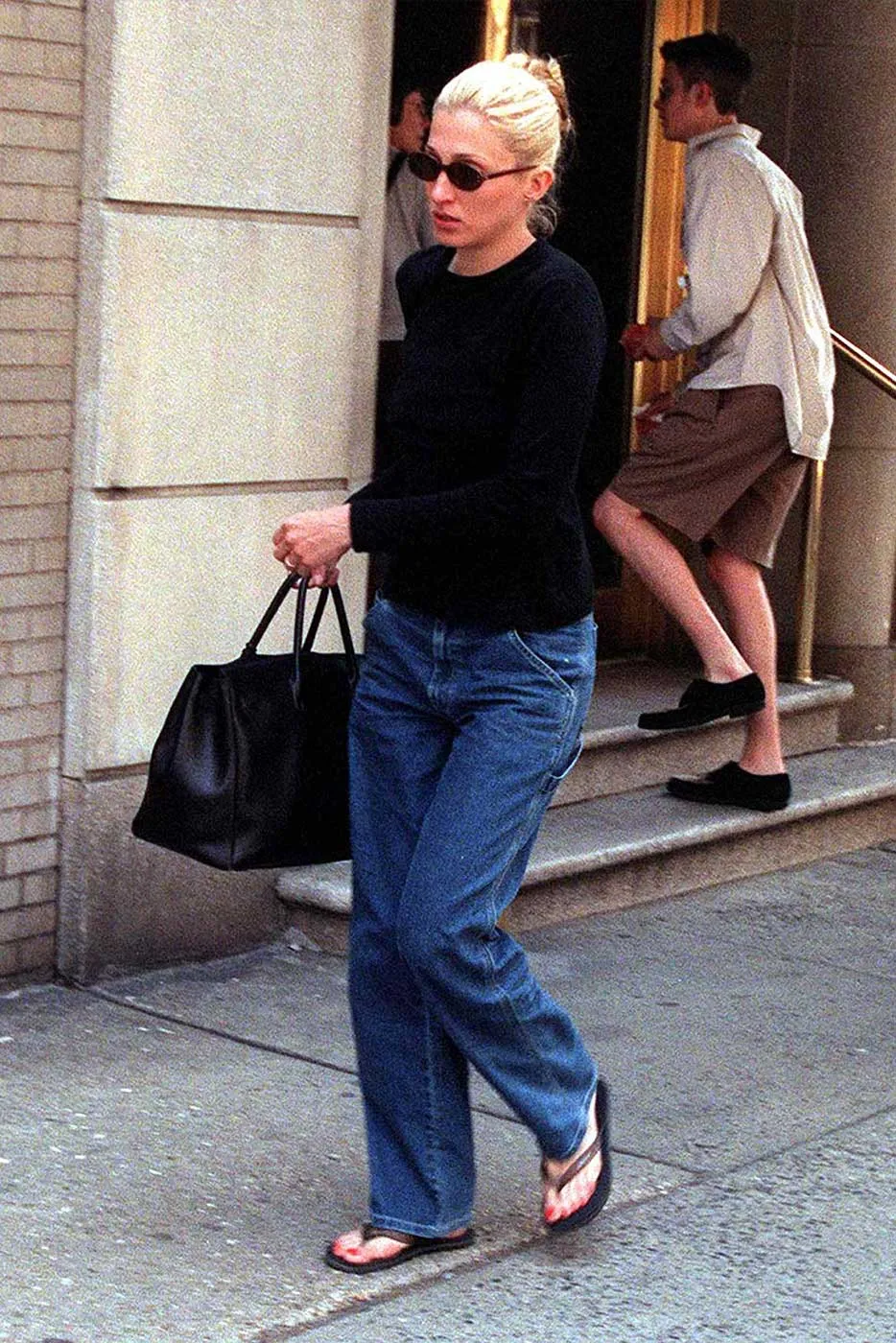 Bessette was known for her minimalist style. Working in fashion, especially at the sleek and simple Calvin Klein, Bessette had an eye for tailoring and texture. During the mid-90s, Bessette was often seen in flare jeans, strappy sandals, and black turtlenecks. She had a weakness for Prada and mastered high-low styling. After her marriage, she incorporated more preppy and dialed-down elements to her wardrobe. She became synonymous with her oversized black Birkin with gold hardware, which she carried on her shoulder, and her gold Cartier Tank Française, which she inherited from Jackie Kennedy.