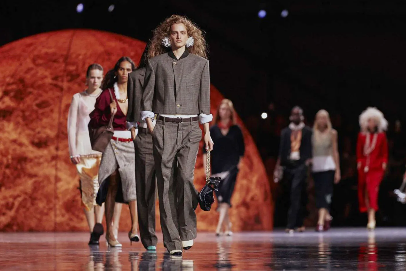 Known for stunt casting in their shows, Miu Miu had many celebs featured on its runway. K-pop star Yeonjun, American actress and IT girl Chloë Sevigny and supermodel legend Kristen McMenamy joined the runway.
